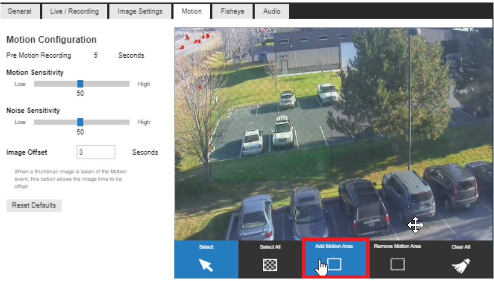 - Add Motion Area will add a motion area where you want. You can create motion grids by selecting the Add Motion Area button and then clicking and dragging the cursor to create a rectangular shaped area. You can add multiple areas.